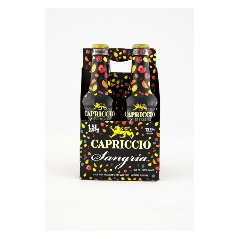 Capriccio Bubbly Red Sangria 4pk of 355 ml"Capriccio Sparkling Sangria is made from an excellent recipe with premium grape wine, real fruit juices (pineapple, orange and grape) and 100% natural fruit flavors such as pomegranate. It has no preservatives, an